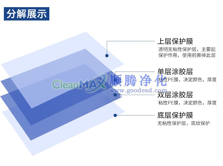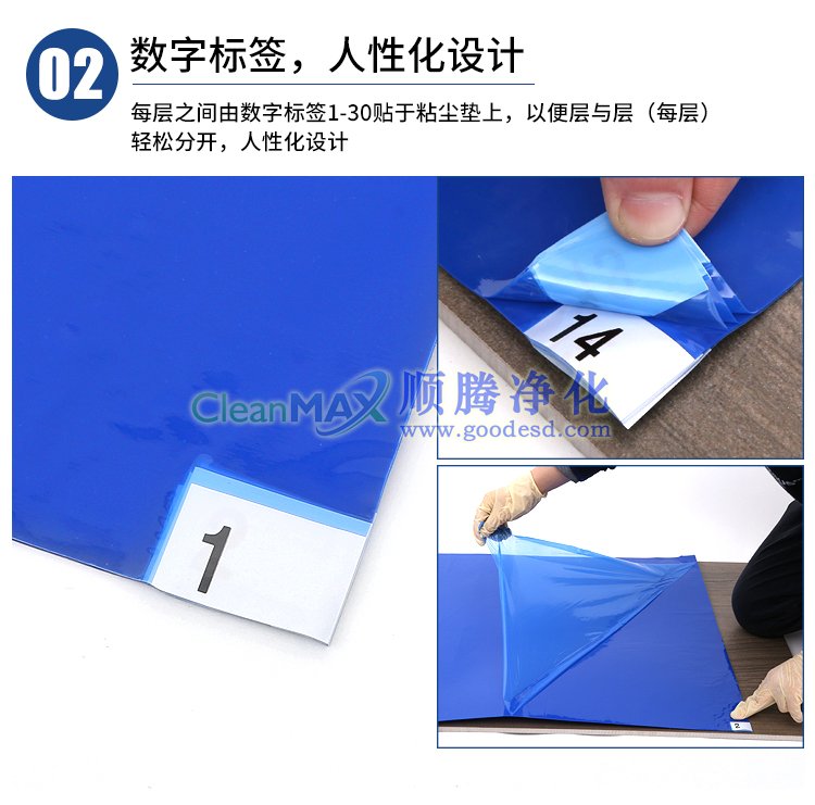 材質(zhì):粘塵墊實(shí)際有32層,其中有30層左或右下角都有1-30或30-1的數(shù)字標(biāo)簽,以便于更換。第一層是無膠PE透明膜+29層涂膠PE膜(通常是天藍(lán)色,其他顏色可定做)+1層涂膠雙面PE天藍(lán)色保護(hù)膜復(fù)合而成的,雙面膜的第一層是天藍(lán)色,上面貼有30或1的數(shù)字標(biāo)簽。第2層是透明無膠PE膜。29層涂膠PE膜每層貼有1-29或者29-1的數(shù)字標(biāo)簽。